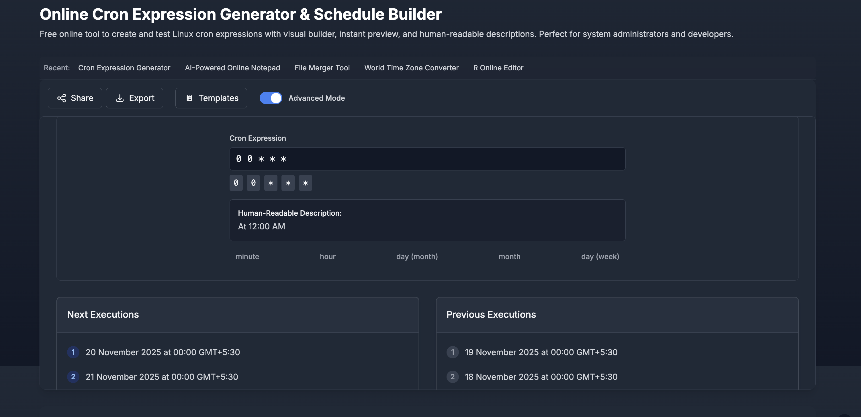 The Cron Expression Generator on tools-online.app provides comprehensive schedule building with intelligent features designed for DevOps and system administration workflows.