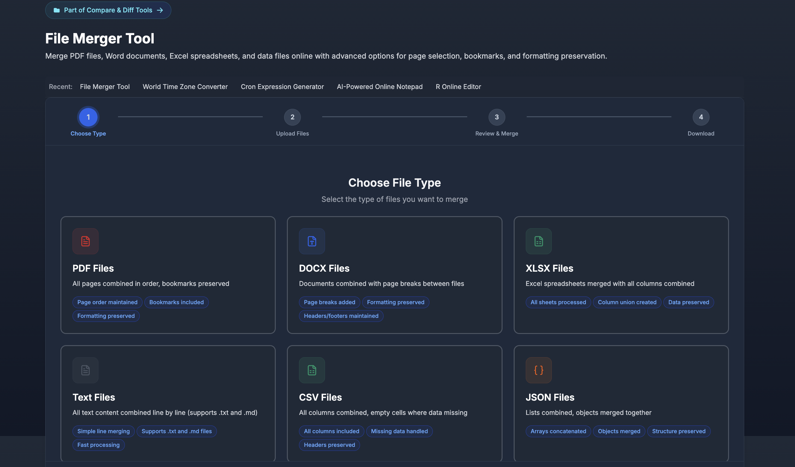 The File Merger Tool on tools-online.app provides a comprehensive file combination with intelligent features designed for business, academic, and technical workflows.